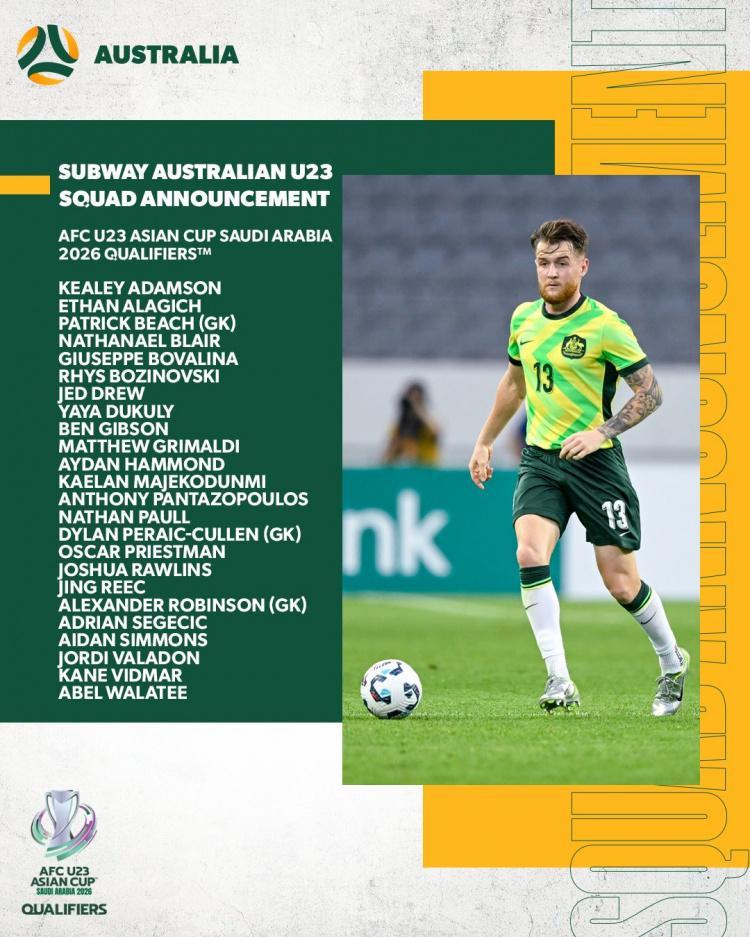 奇尔卡蒂、海登-马修斯、凯西-博斯等2003/2004年龄段球员相继入选澳大利亚国家队,他们也都无缘本期澳大利亚U22队阵容。相对比较令人意外的是,今夏加盟夏洛特FC、被誉为澳大利亚队锋线“金童”的阿奇-古德温也没有入选。此外,曾参加过卡塔尔世界杯、现效力于英超纽卡斯尔联U21队的前锋加朗-库尔也无缘入选。